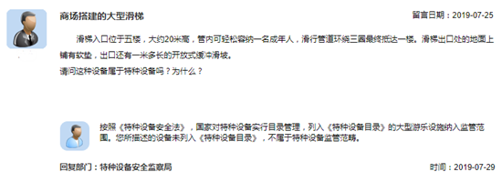 有網(wǎng)友于7月25日在國(guó)家市場(chǎng)監(jiān)督管理總局網(wǎng)站公眾留言系統(tǒng)咨詢商場(chǎng)搭建的大型滑梯是否屬于特種設(shè)備,7月29日,市場(chǎng)監(jiān)管總局特種設(shè)備安全監(jiān)察局給予了答復(fù)。