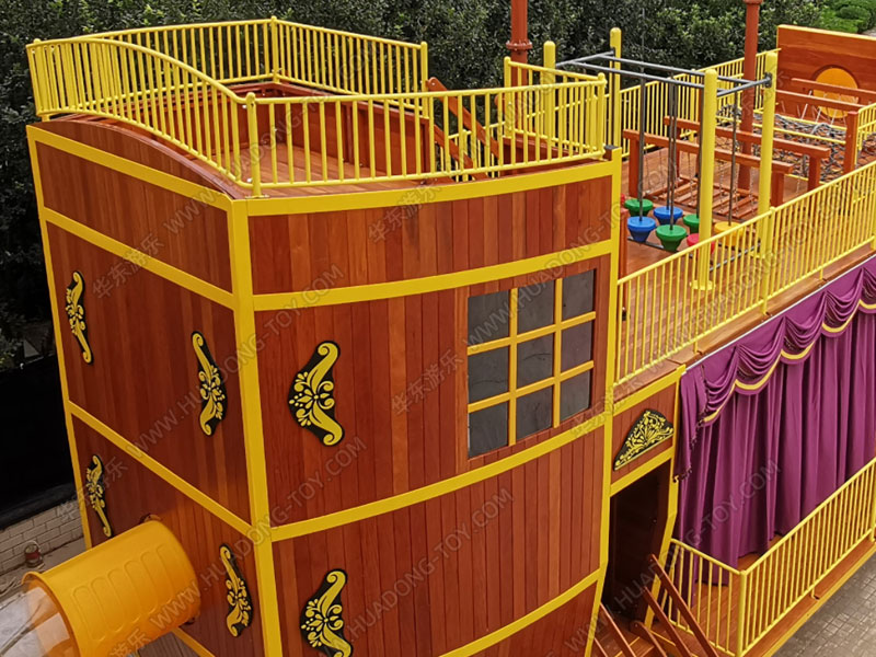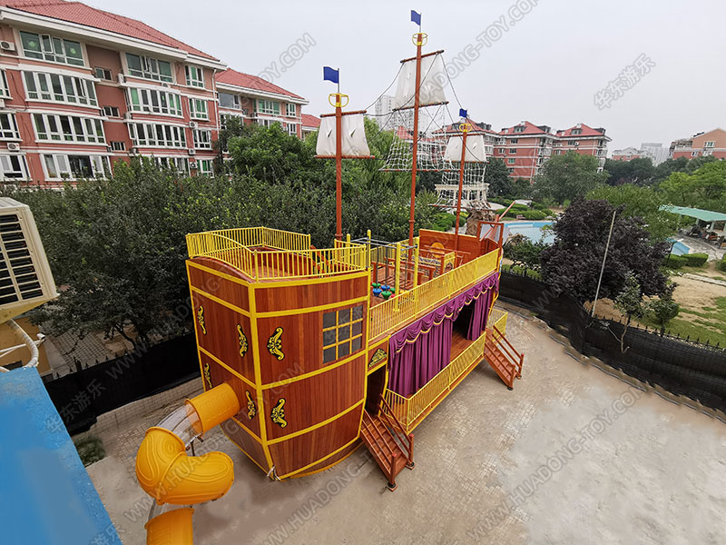北京幼兒園案例是一個(gè)以海盜船為模型設(shè)計(jì)的游樂設(shè)施,該項(xiàng)目整體采用木質(zhì)結(jié)構(gòu)進(jìn)行設(shè)計(jì),改變了以往海盜船的設(shè)計(jì)風(fēng)格,為結(jié)合整個(gè)場(chǎng)地的合理化利用,新增了演出舞臺(tái)、平衡蕩橋、組合滑梯、鉆洞爬網(wǎng)、踩樁 等游樂設(shè)備。