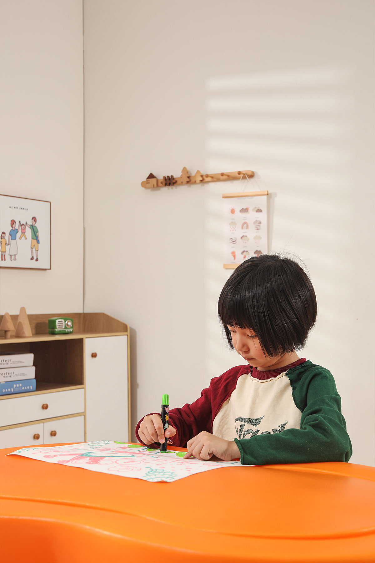 儲(chǔ)物柜的設(shè)計(jì)充分考慮了兒童的收納需求,柜內(nèi)分隔合理,便于孩子分類存放玩具和學(xué)習(xí)用品。同時(shí),柜子采用滑動(dòng)門設(shè)計(jì),開合順暢,安全可靠。