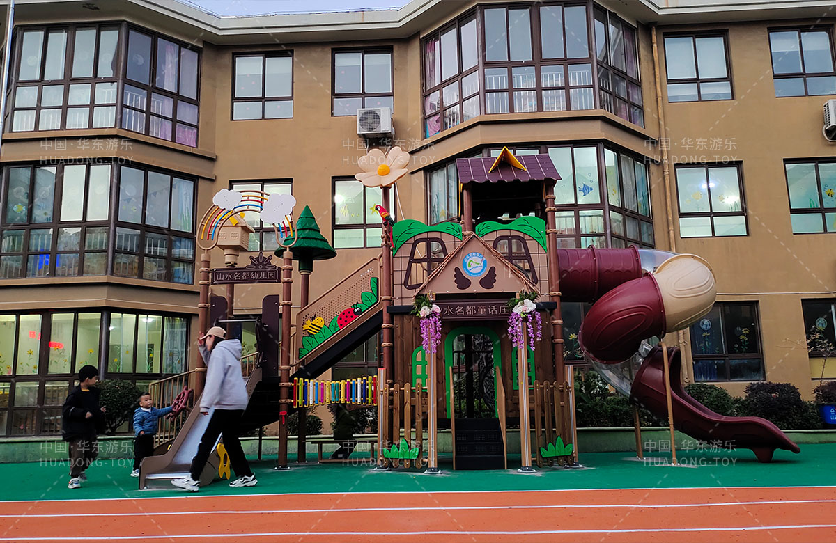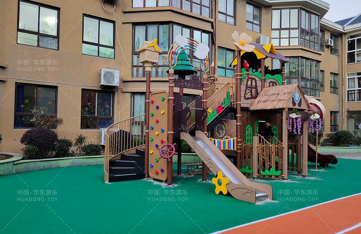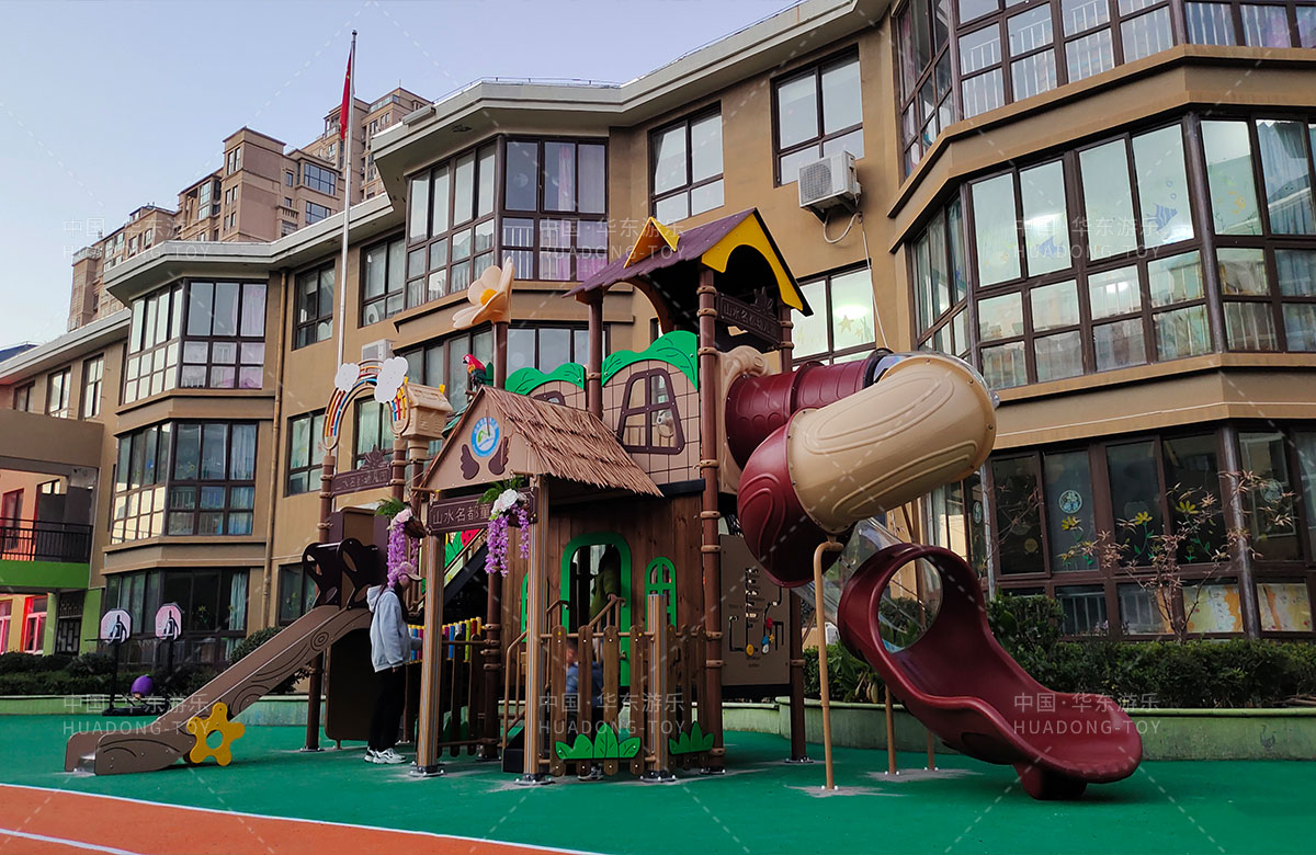 江蘇省淮安市山水名都幼兒園是一家專業(yè)的學(xué)期教育培訓(xùn)機(jī)構(gòu),此次選用的是華東游樂自主研發(fā)和設(shè)計(jì)的通話莊園系列組合滑梯,該設(shè)備具備了攀爬網(wǎng)、攀爬墻、打擊樂器、旋轉(zhuǎn)滑梯等功能,是一款功能齊全、主題鮮明、顏色艷麗、品質(zhì)優(yōu)越的綜合性游樂設(shè)備,非常適合幼兒園。