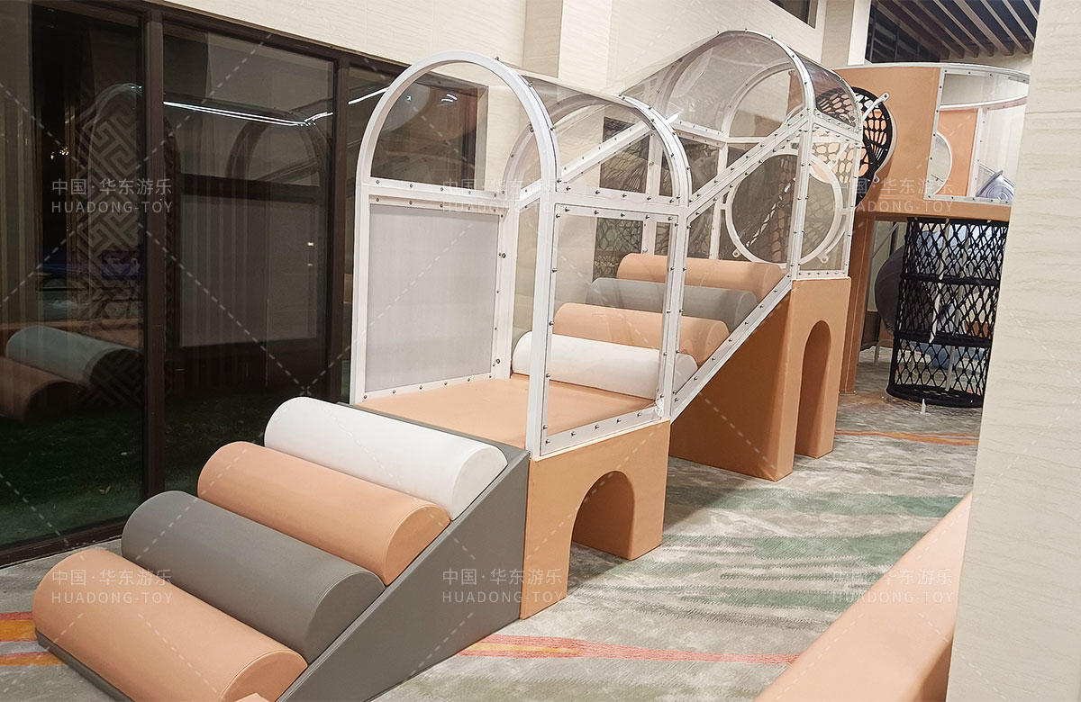 該項(xiàng)目選用的是華東游樂(lè)生產(chǎn)的室內(nèi)淘氣堡系列產(chǎn)品,整套設(shè)備集合了攀爬網(wǎng)、鉆洞、攀爬梯、旋轉(zhuǎn)滑筒等功能,除此之外還設(shè)置了小朋友們喜歡的毛毛蟲鉆洞,兒童臺(tái)球、乒乓球、桌面足球等設(shè)備,讓整個(gè)售樓處變得更加的充滿生機(jī)與活力。