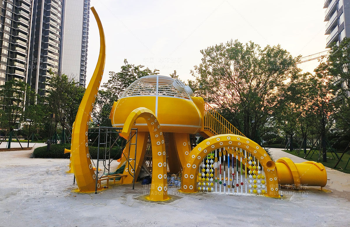 中海地產(chǎn)汕頭閱江府選用的是華東游樂自主研發(fā)和設(shè)計的以章魚為主題而設(shè)計的非標(biāo)定制的章魚主題綜合游樂園,整個游樂園用一個大型的章魚設(shè)備為主題,設(shè)計了集鉆洞、攀爬網(wǎng)、滑梯、打擊樂器等功能為一體的綜合性游樂設(shè)備,為生活在當(dāng)?shù)氐娜巳禾峁┝艘粋€休息娛樂的場所,也為小朋友們的健康成長提供了保障。